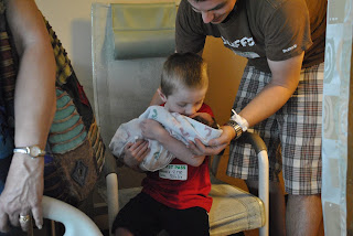 23 weeks 5 days ultrasound: Babies A and C looked great. They are growing well and completely healthy. When they got to Baby B and started measuring her head and abdomen I was getting a little nervous. Everything kept saying 19 weeks 1 day, or somewhere in that range. It is really scary when one of the babies is not growing as well as the others, and I really didn't want to have all of these babies come really early. The other babies had been measuring around 24 weeks, so this was a big difference. Then she went to measure the heart rate and could not find a heart beat. She stepped out of the room to get the doctor and started praying that somehow she was wrong, even though I knew she wasn't because Baby B was so small. The doctor came in apologizing for our loss, asking why Bob wasn't there, and explaining that the baby had probably died shortly after our last ultrasound because she wasn't much bigger than last time. She said we would never know the cause of death because that would require an autopsy be done now, and that is not possible when there are two other babies that have to stay in me. She said she thought it was unlikely that the amnio caused her death, because usually when that is the case it is due to infection and you lose the whole pregnancy. I personally think that Baby B was clearly struggling and that even if the amnio was the straw that broke the camels back, it would have happened eventually. I had Ezra with me at the doctor and kept a brave face until about the time we got to the car. I strapped him in, gave him is Kit Kat for being good at the doctor, and turned on the radio so he would be oblivious to my crying, I wasn't ready to talk to him yet.